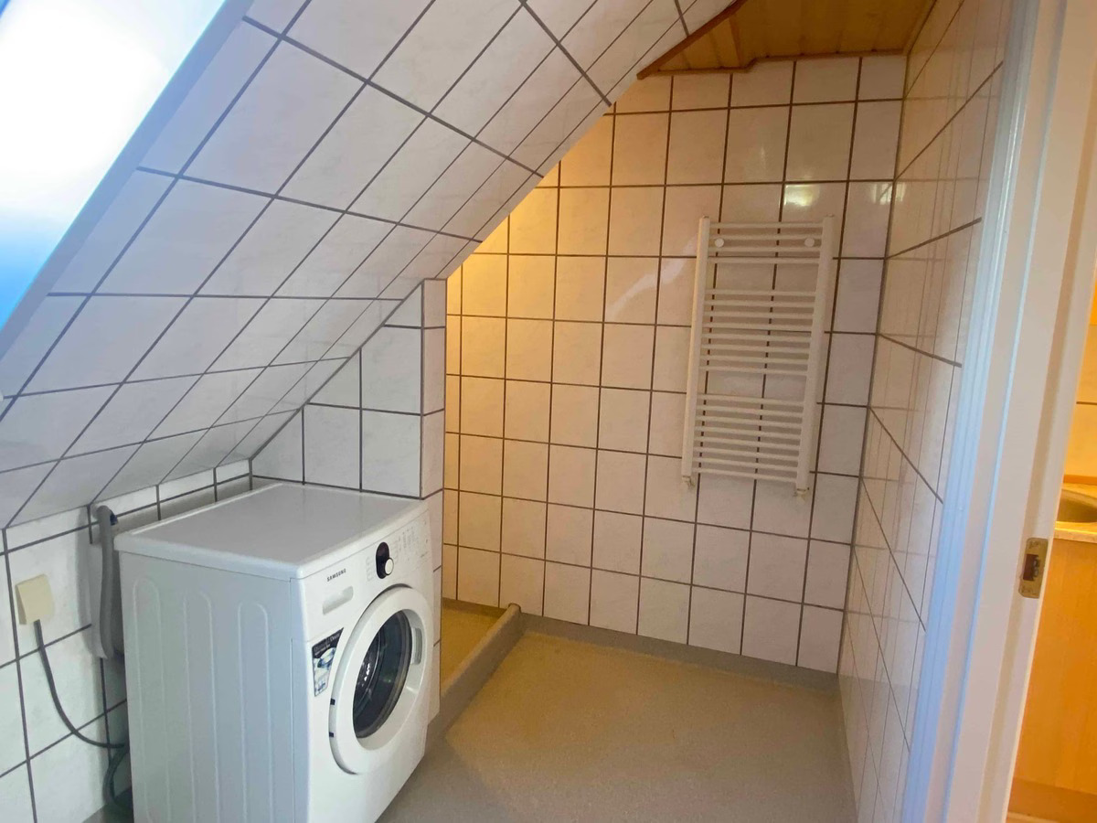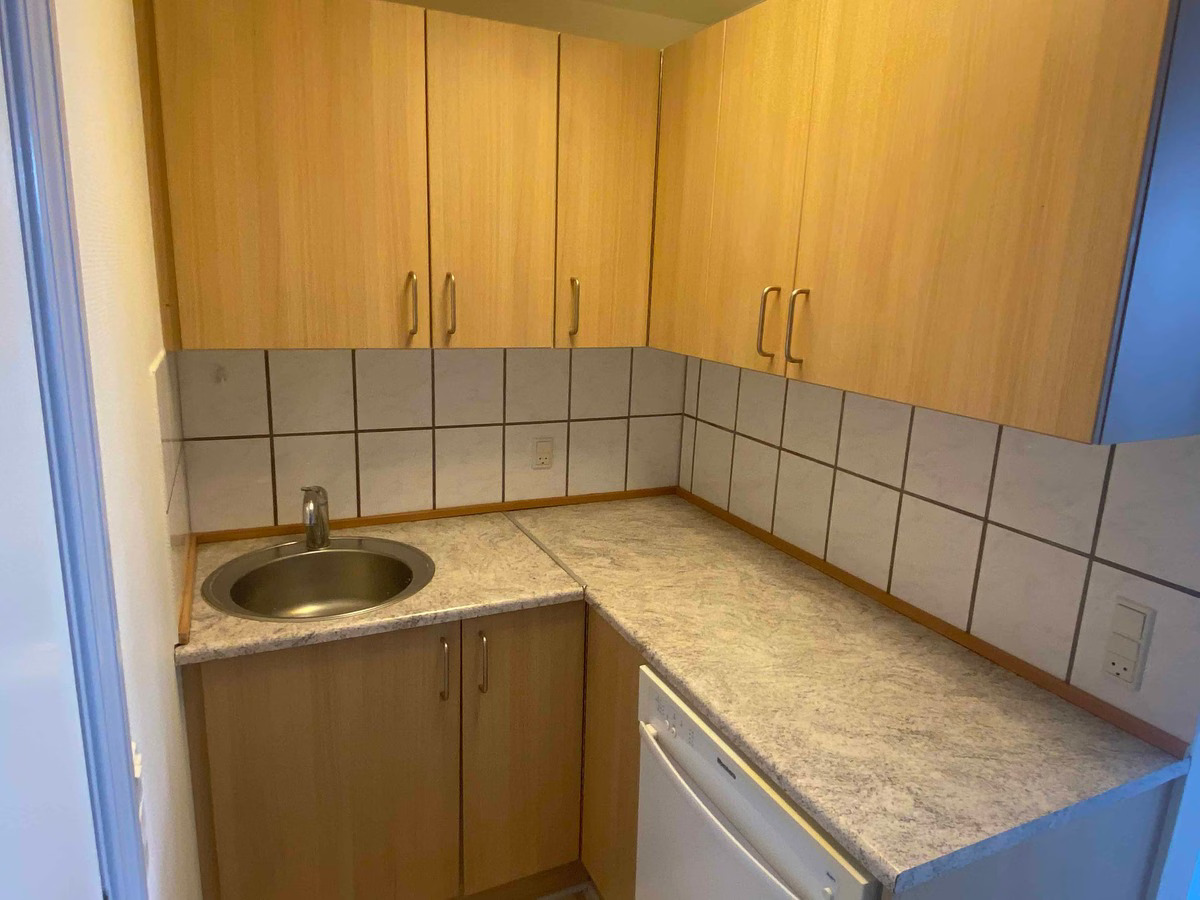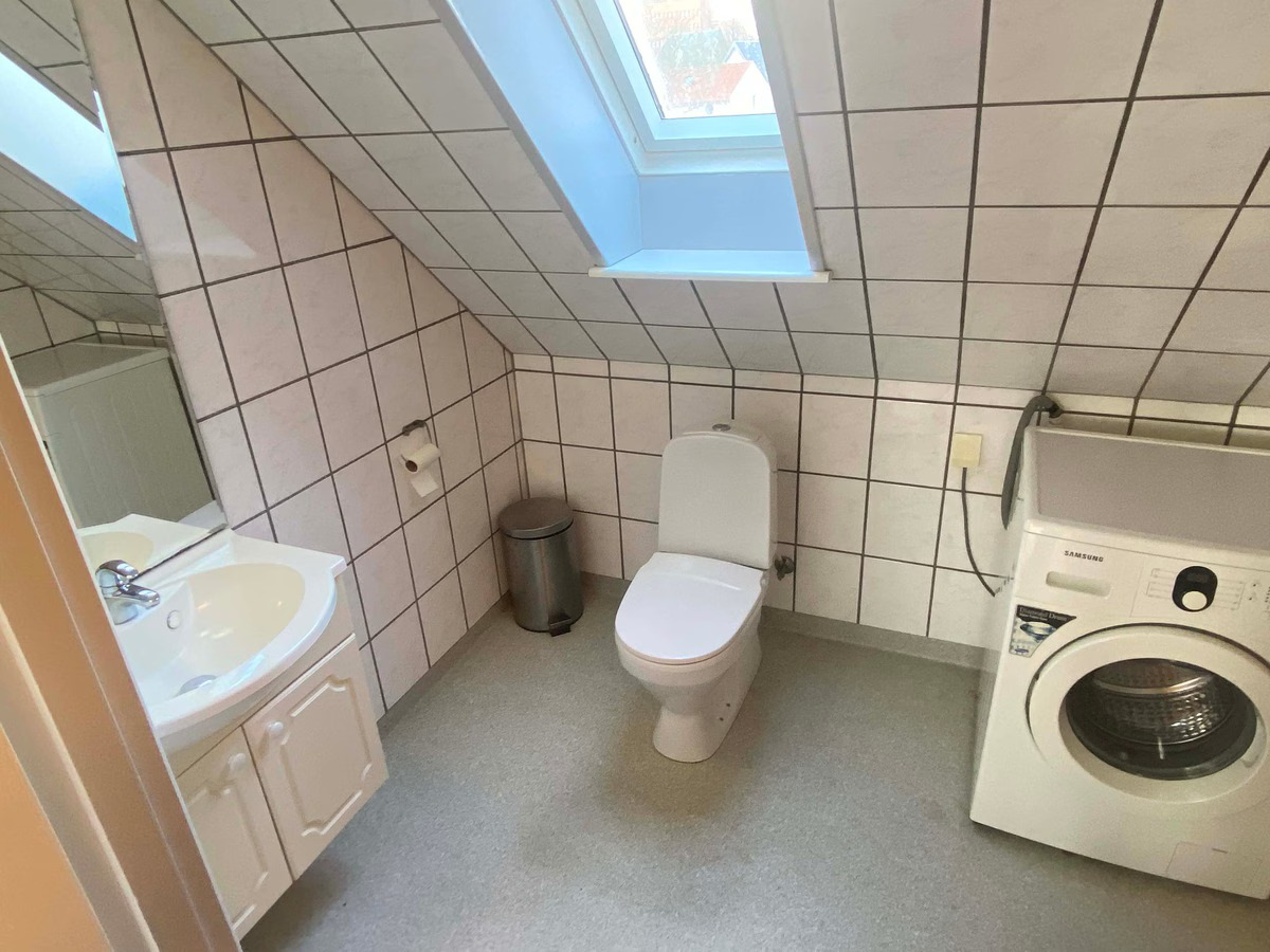 Lejligheden fremstår nymalet med flotte gulve og har et stort badeværelse med separat bruseniche, hvor vaskemaskinen er placeret. Køkkenet er veludstyret med opvaskemaskine, så hverdagen fungerer nemt og praktisk.
